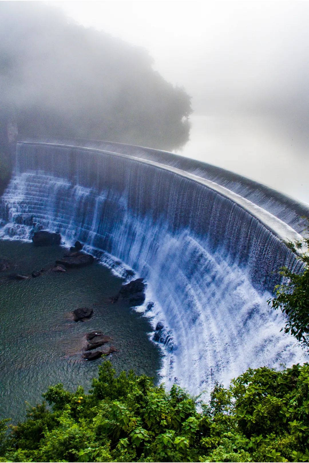 Окружённый зелёными горами, поднимись повыше и взгляни — бескрайняя зелень раскинулась перед глазами, словно разлитые чернила. Изгиб бирюзовой воды огибает изумрудные берега, обвиваясь в дымке, как полупрозрачный нефрит.