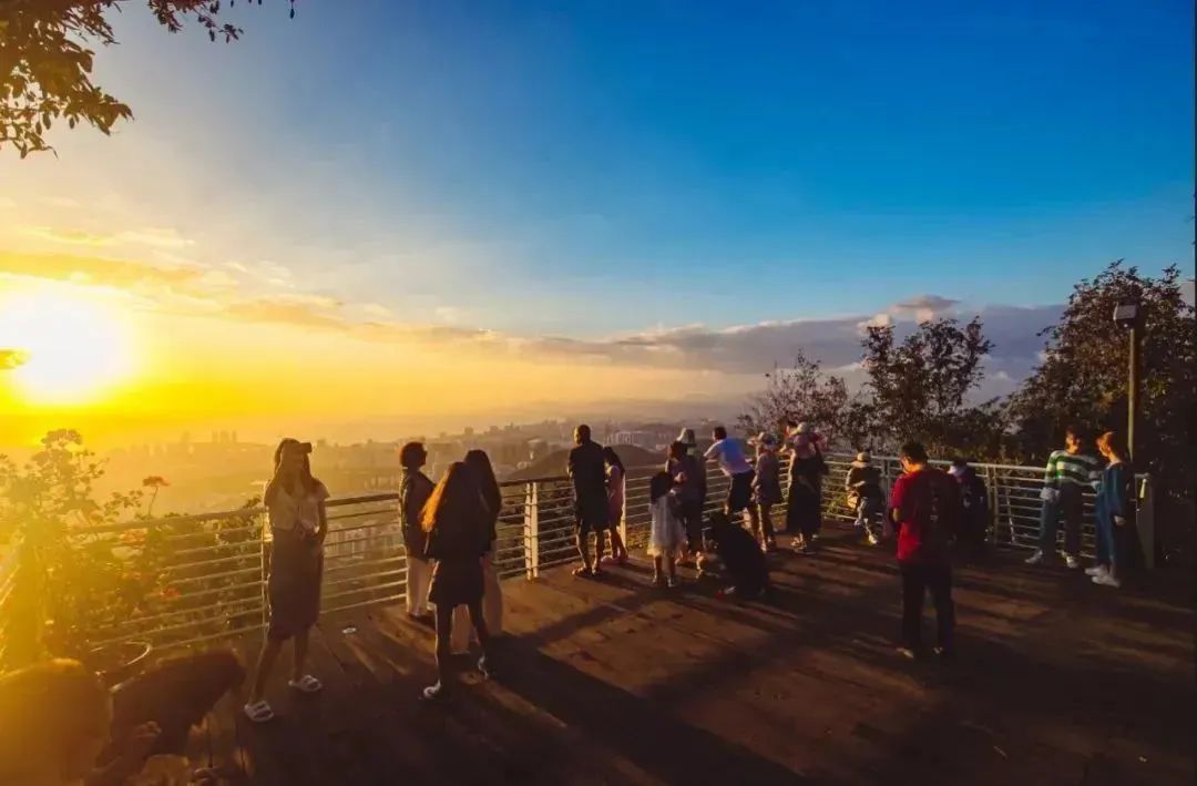 Вечером на холме Лухуэйтоу оранжево-красные сумерки покрывают небосклон, переплетаясь с бурлящим морем облаков. В вечерний час море облаков танцует с закатом, небосклон переливается от оранжево-красного к розовато-фиолетовому, словно рассказывая клятвы любви тысячелетней давности.