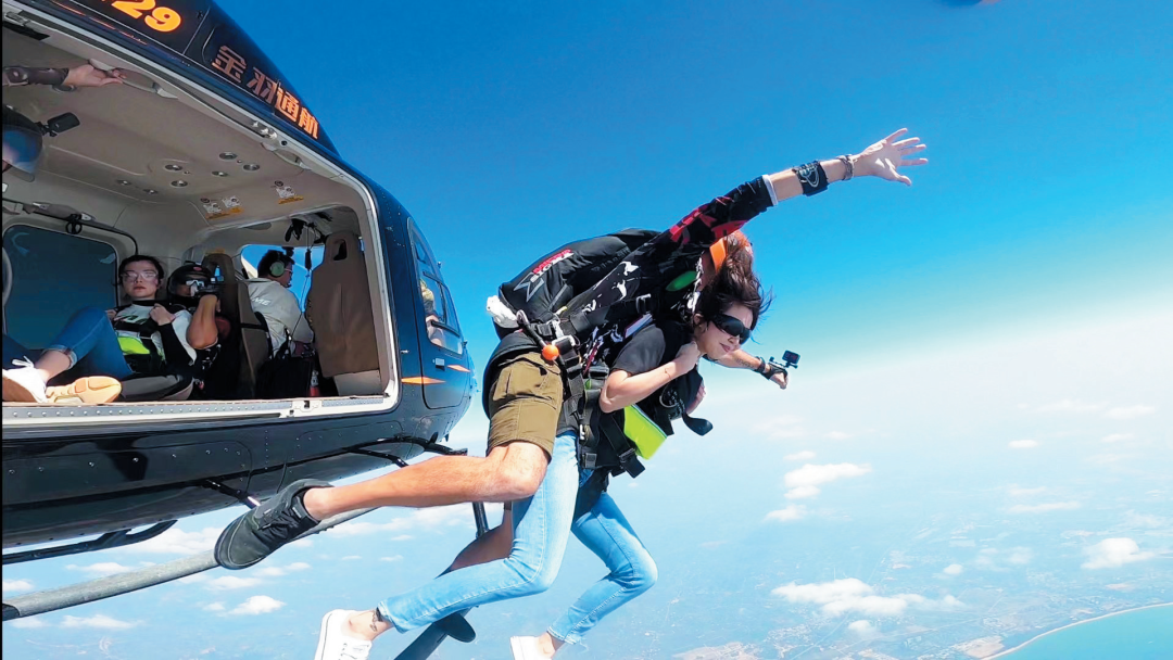 Ван Цзы, туристка, родившаяся после 1995 года («пост-95»), рассказала, что в момент прыжка из самолета ветер на высоте 4000 метров смешался с биением ее сердца, а безбрежное синее море залива Саньявань открылось перед ее глазами во всей красе. Она встретила свое 30-летие этим особым видом спорта — прыжком с парашютом.