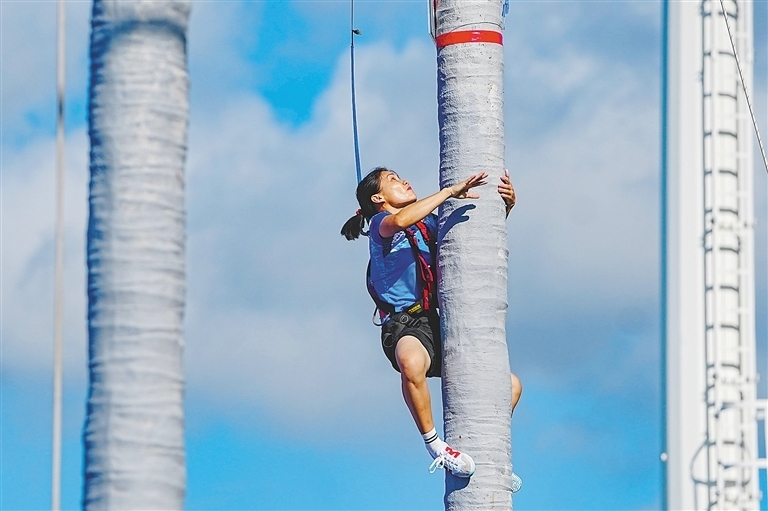 二〇二三年全国攀椰竞速比赛暨第十二届全国少数民族传统体育运动会攀椰竞速测试赛决赛中,选手奋勇攀爬。(资料图)