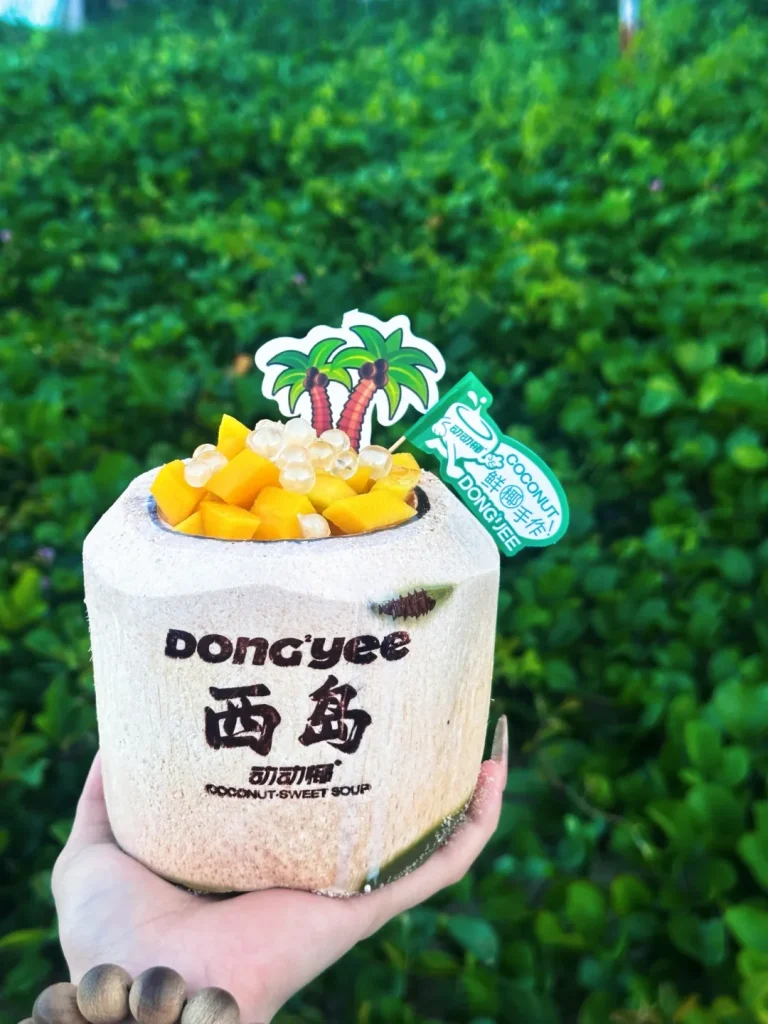 岛上的生活,离不开一杯慢慢喝的咖啡和一份带着热气的小食。S.down Coffee 是西岛本土的咖啡品牌,简单的空间,干净的吧台,主打“慢下来”的理念。蓝天白云、白桃风味、清爽果饮,每一杯都更像是岛屿天气的延伸,适合坐在门口,看人来人往。不远处的动动椰,则把斑斓与椰香融进日常甜品。清补凉、椰奶冻、斑斓华夫饼,口味清新,份量实在。很多人会带着甜品走到海边,一边吃,一边看浪花翻涌。