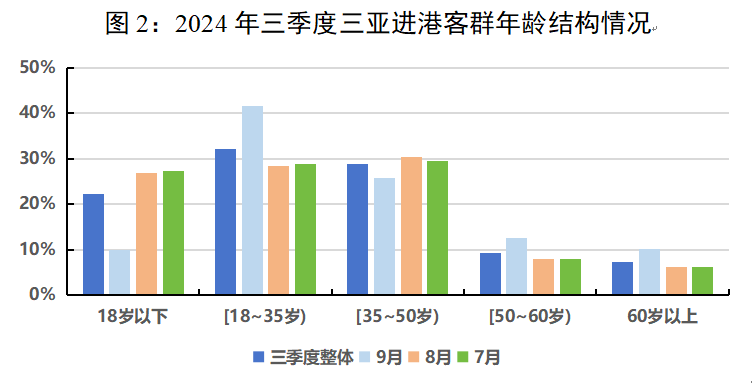 1.川沪京为进港客源地前三。三季度三亚机场旅客吞吐量512.24万人次,环比提高14.74%,同比下降3.03%。9月超级台风“摩羯”造成省内机场停航,强台风“贝碧嘉”对江浙沪游客出行产生不利影响,整体进港客流同比小幅下降。三亚旅游大数据平台显示,四川、上海、北京、广东、湖南位列客源地前五。其中,河南、江苏及湖南的进港客流同比分别增长18.6%、4.7%及1.9%。结合年龄结构来看,7至8月亲子家庭客群出游占比高,进港18岁以下客群占比为27.1%;9月则以错峰游青年客群为出行主力,进港18—35岁青年客群占比达41.6%。