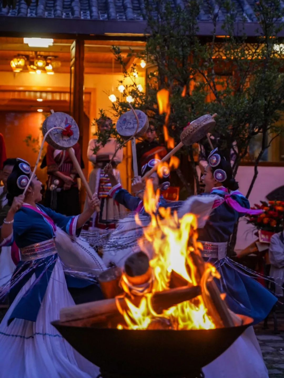 在丽江,夜色渐浓,火光跳跃,映照着舞者的身影,他们身着彩衣,如同从古老壁画中走出的精灵,用舞蹈诉说着纳西族的故事。