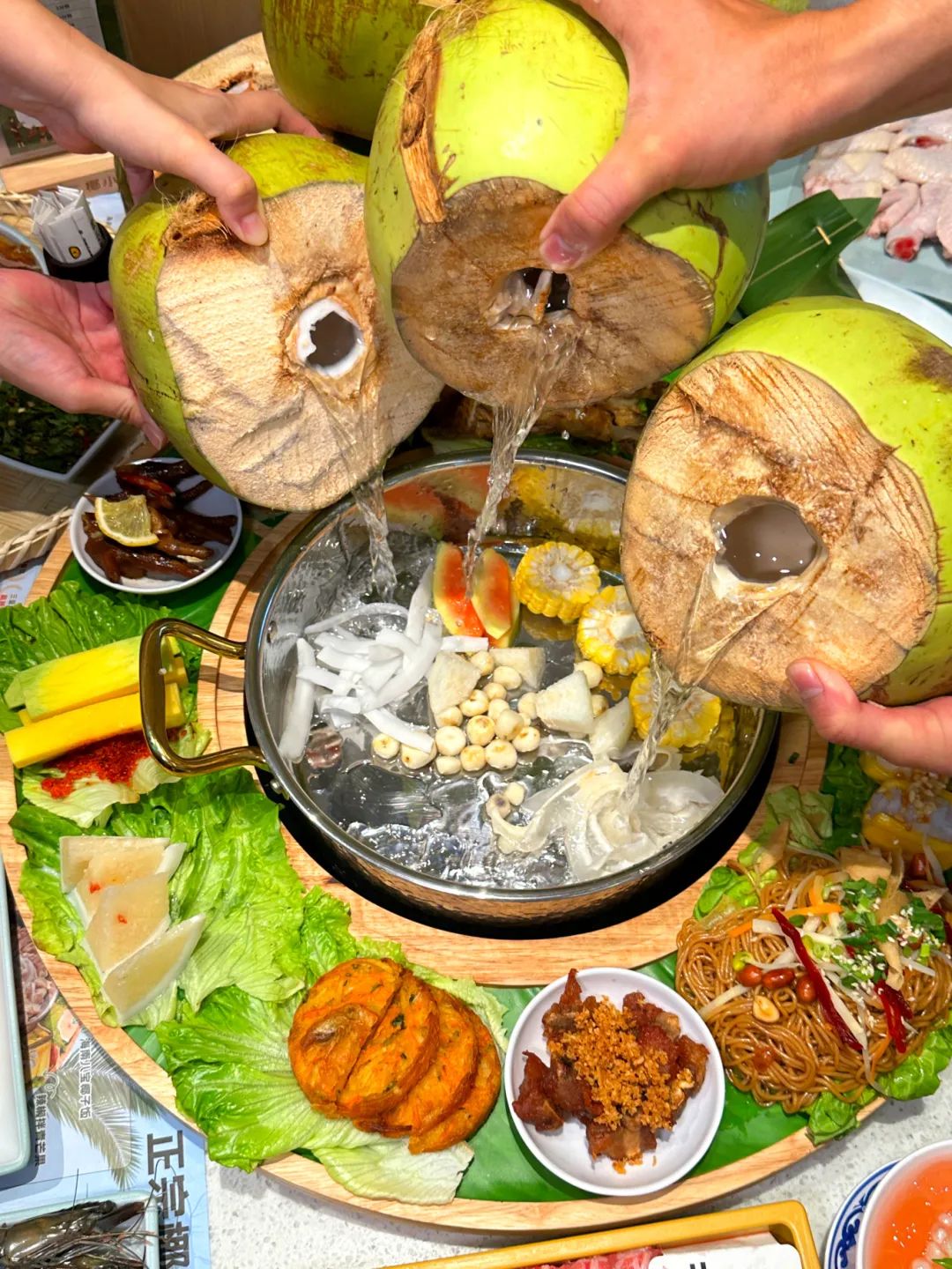 作为海南本土美食的标杆,椰子鸡以 “食材至上” 的理念传承养生智慧。严选海南当季青椰,颗颗汁水丰盈如琼浆,每锅汤底均以三个当日现采椰青鲜榨而成,不加一滴水的纯粹,奠定了清冽回甜的基调。