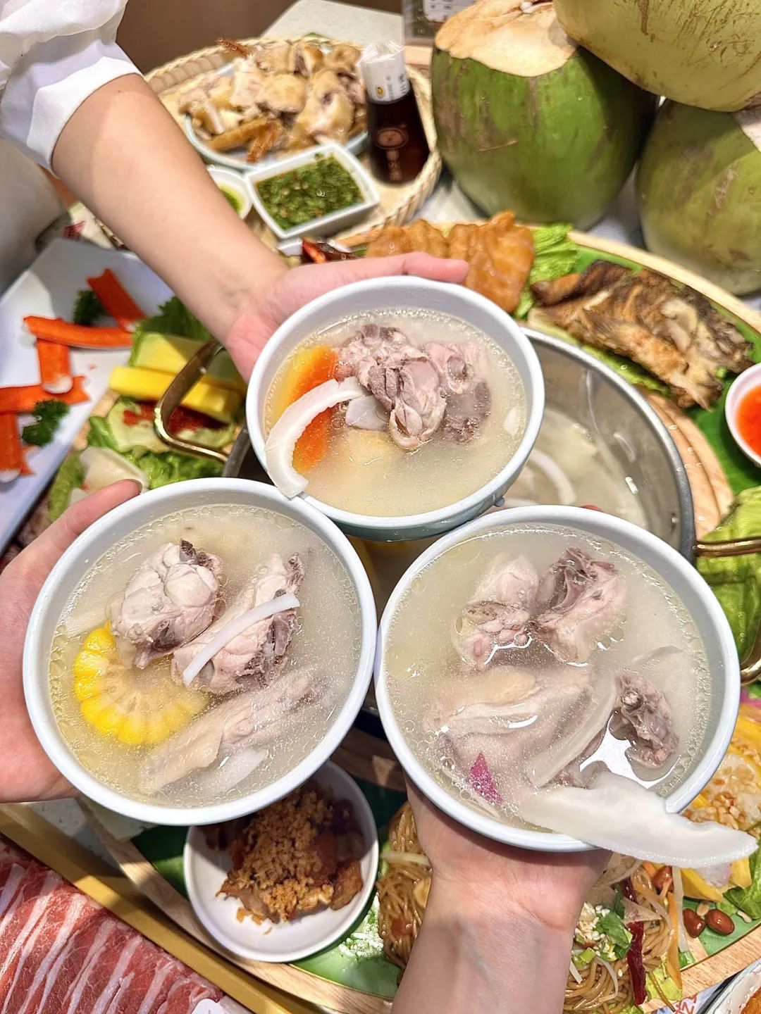 先来一口热乎乎的汤,清甜不腻。肉质鲜嫩紧实且不油腻,融合了椰香后有一丝淡淡的甜味~一块接着一块,美味根本停不下。