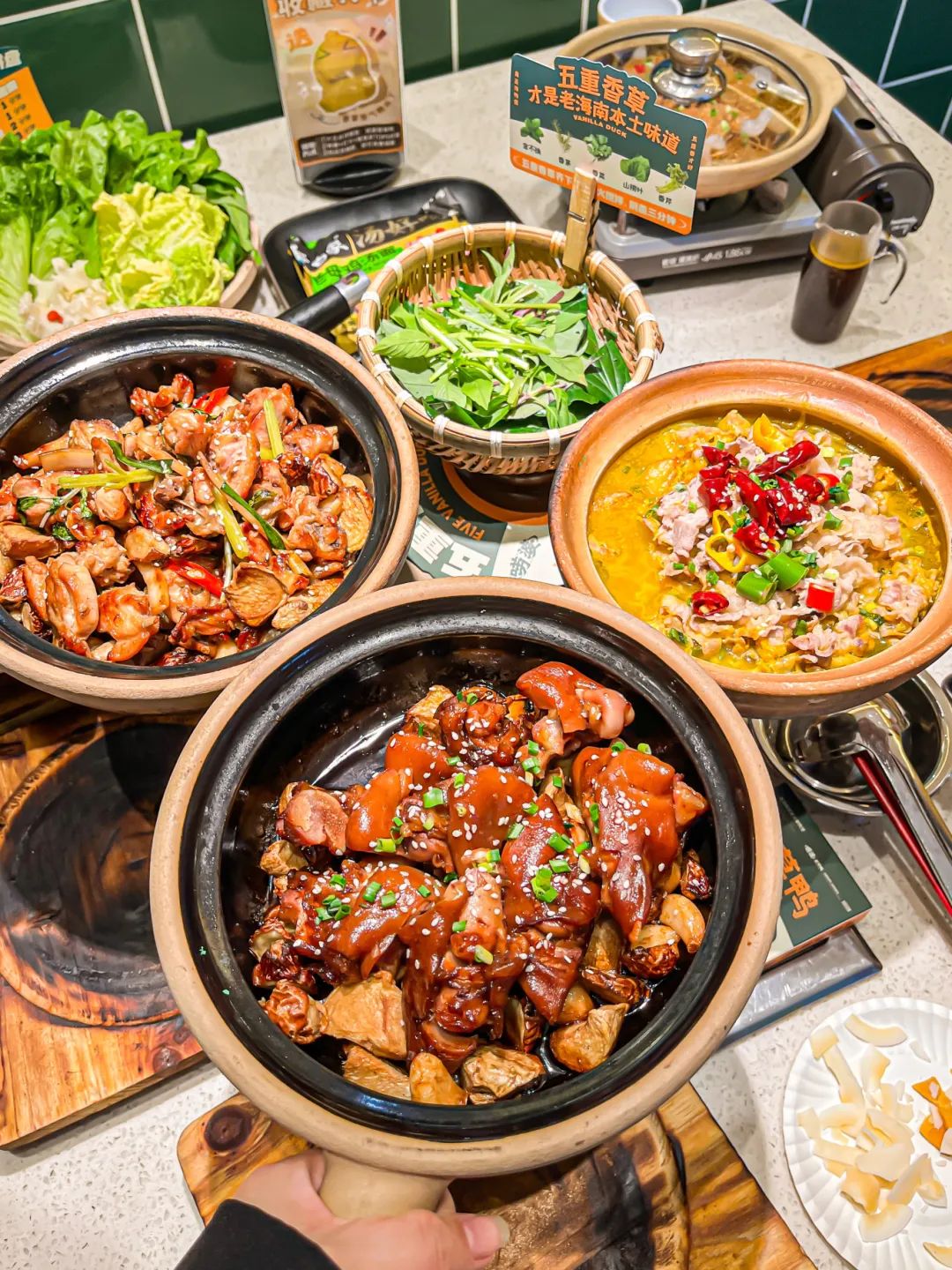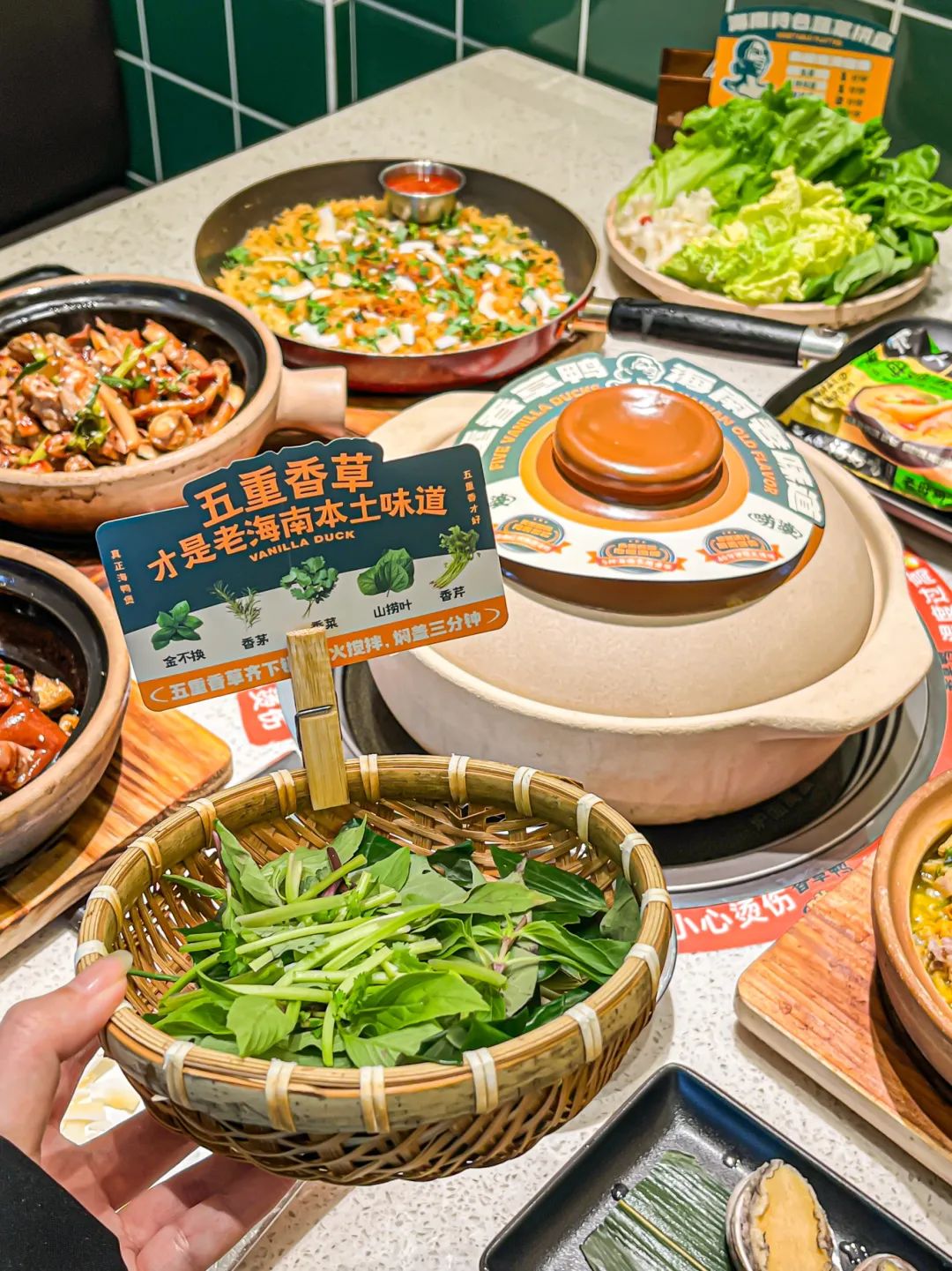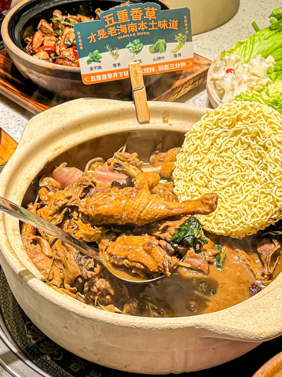 文火土煲慢炖40分钟以上,开锅加入五重香菜 金不换、香茅、香菜、香芹、山捞叶一起捞煮,鸭肉的咸鲜味被激发了出来,这才是唠婆香草鸭的味道。